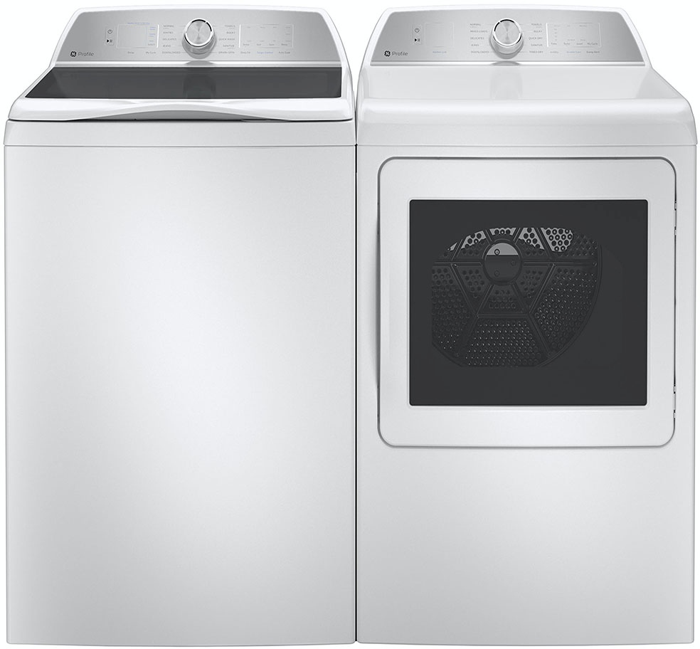 GE Profile™ White Top Load Laundry Pair with a 5.8 cu. ft. capacity top load washer and a 7.4 cu. ft. capacity front load gas dryer.Read More