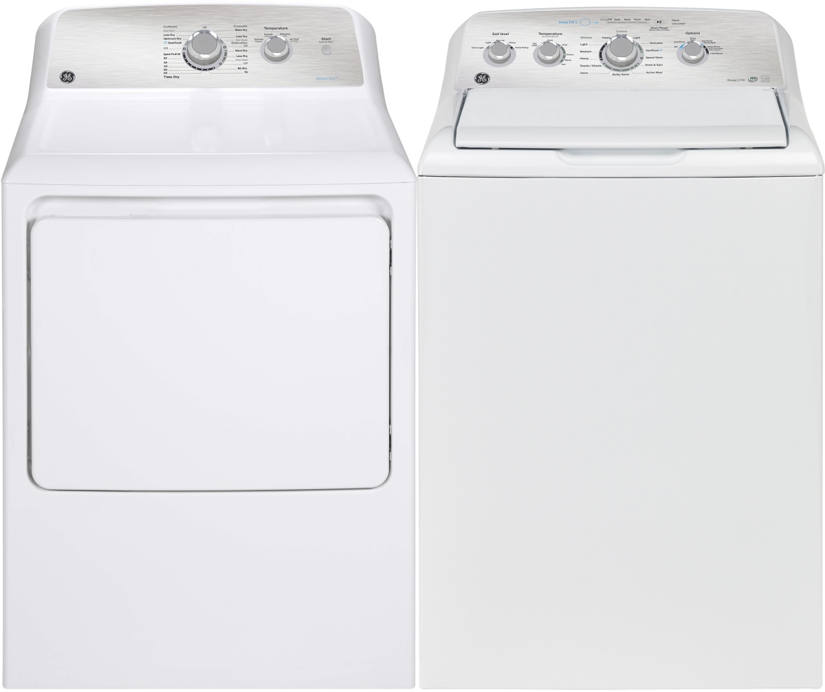 GE® White Laundry Pair with a 5.0 cu. ft. capacity top load washer and a 7.2 cu. ft. capacity front load electric dryer.Read More