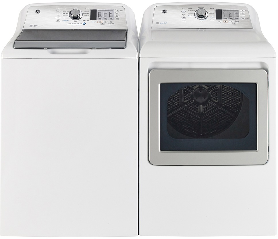 GE® White Pair with a 5.2 cu. ft. capacity top load washer and a 7.4 cu. ft. capacity front load electric dryer.Read More