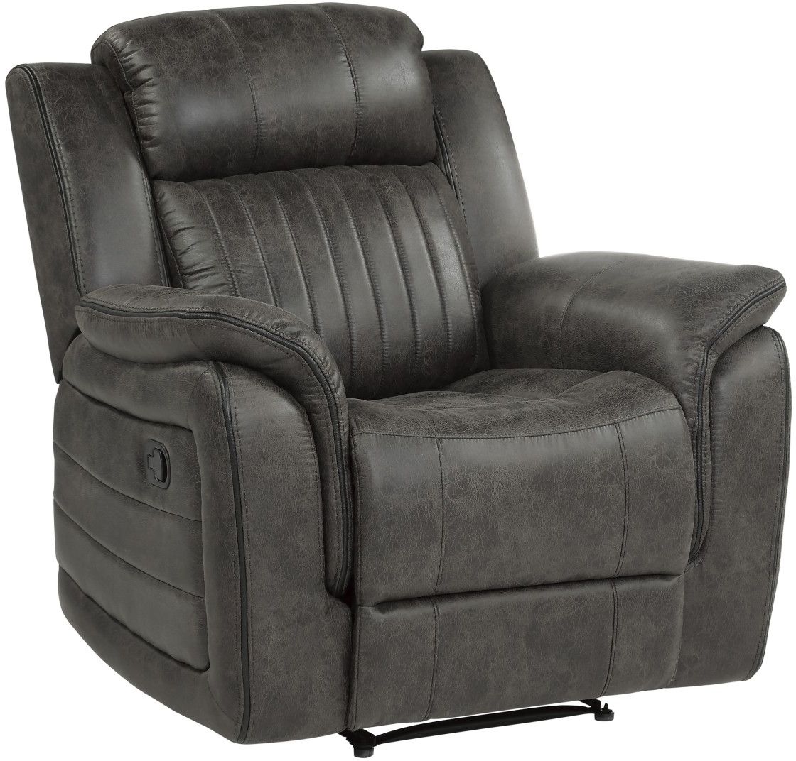 Plush seating features vertical tufting, pillow-top arms, enhanced by the reclining mechanism which is engaged with a pull of the side mounted tab, taking you from seated to prone in an easy motion.
