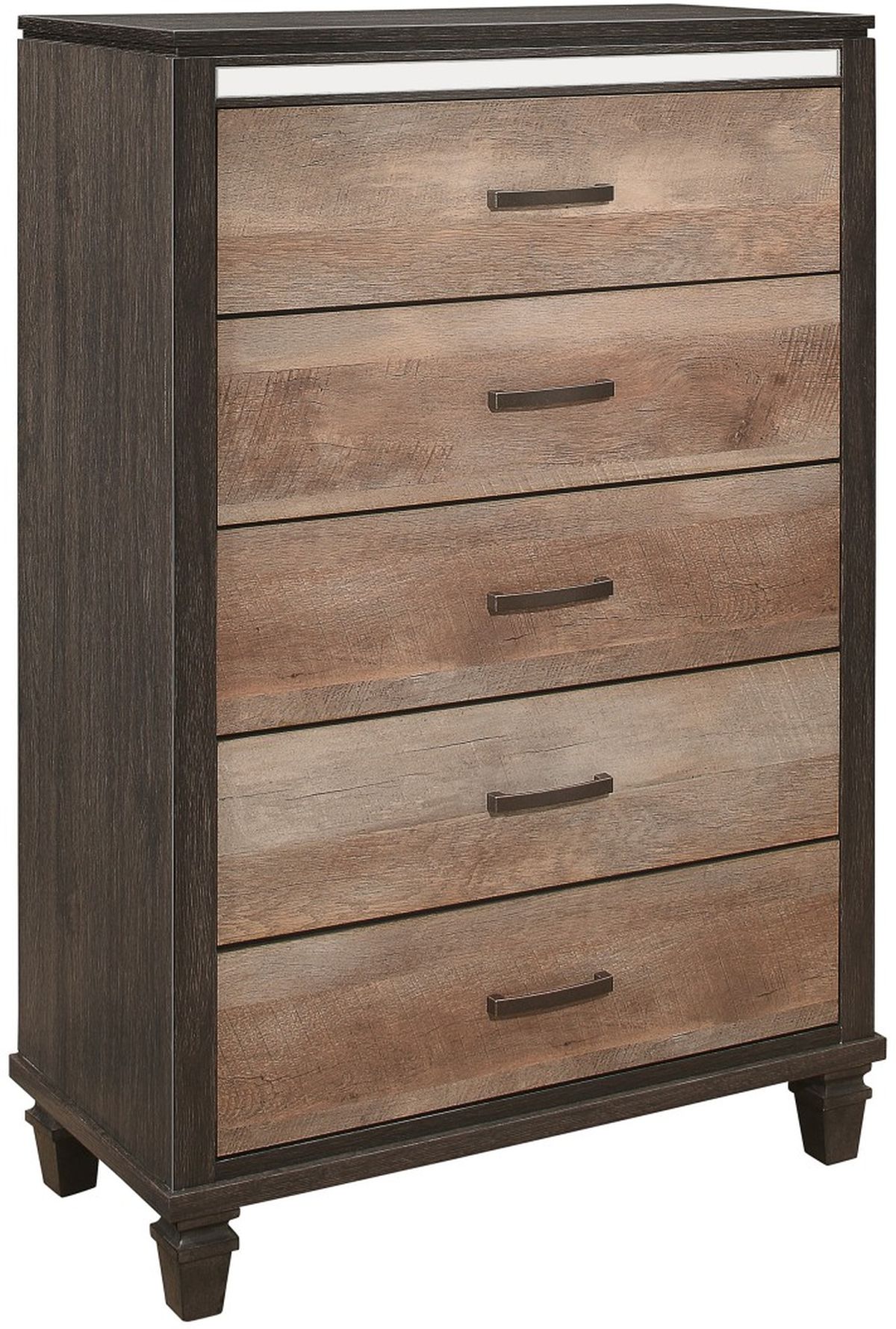 Rustic style is paired with modern accent to create the bold look of the Danridge Collection. Paper laminate veneer presents a realistic wood-look with brown and cappuccino blending to create the two-tone finish. Antiqued brass finish hardware fronts the drawers of the chest and a mirrored strip provides decorative accent.