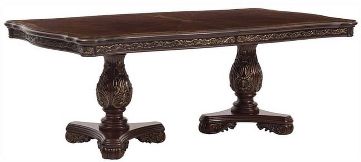 Stately from every angle, sophisticated design elements blend to create this beautiful dining table.?Burl inset flanks the book-match veneered cherry-finished tabletop. The cherry finish is highlighted by gold tipping that accentuates the traditional dining table.Read More