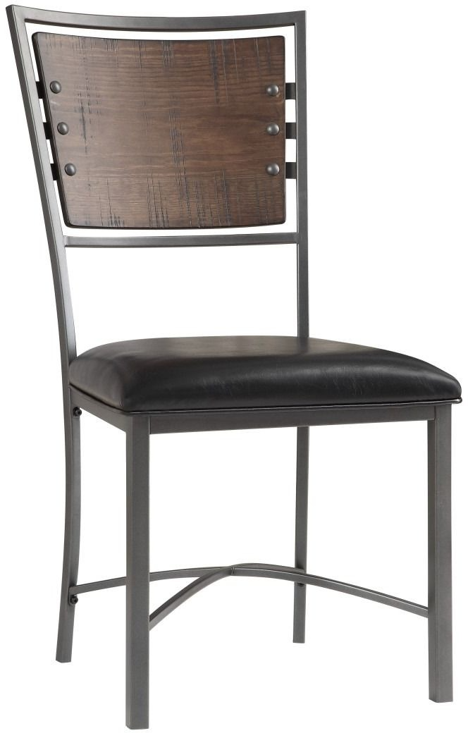 Wood and metal are combined to create the rustic industrial style of the Fideo Collection. Metal framing supports the table and creates the profile of the wood-backed side chairs in this casual dining set. Pine solids and veneer are featured in a herringbone pattern and have been given a burnished finish to complement the gray metal frame.Read More