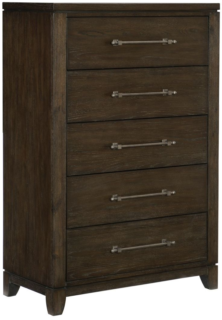 The contemporary styling of the Griggs Collection will be the perfect addition to your bedroom. The chest’s prominent ash veneer over acacia solids features an espresso finish lending to the modern appearance. Elongated fixed drawer pulls center each drawer front further lending to the soft modern look.Read More