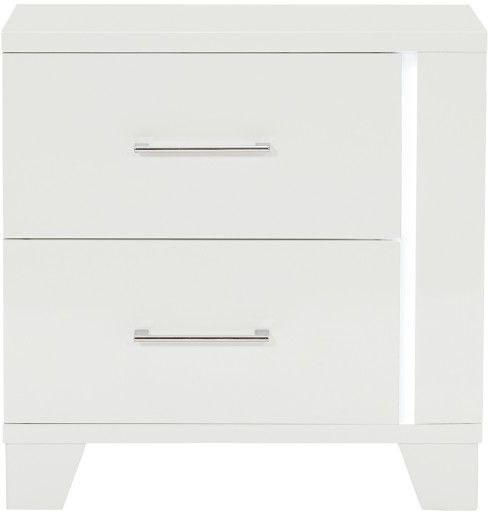 The visually stunning Kerren Collection is a modern study on line and light. LED enhances the front side of each case piece and top rail of the bed. Providing additional eye-catching drama is the white opalescent bi-cast vinyl headboard, shimmering in the glow of the LED light. The door dresser provides ample space for storage alongside the nightstand and chest.