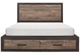 The queen embossed faux-wood veneer is utilized in both mahogany and ebony to achieve a 2-tone contrasted finish. Antique brass tone hardware provides additional contrast to the printed wood grain. Drawers are featured on the footboard creating extra storage space.Read More