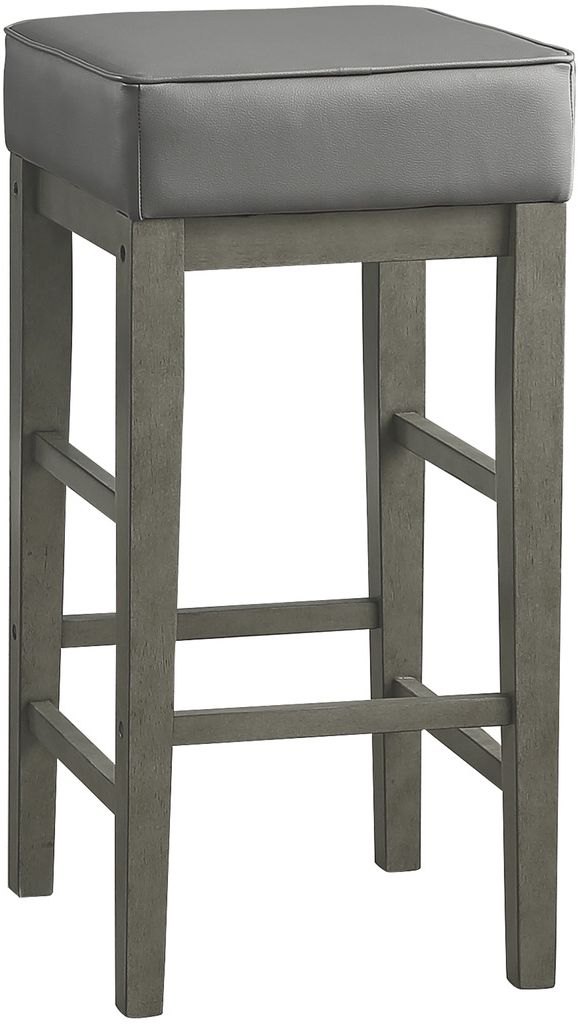 The square gray faux leather seat is paired with antiqued gray finished wood framing for decorative versatility.