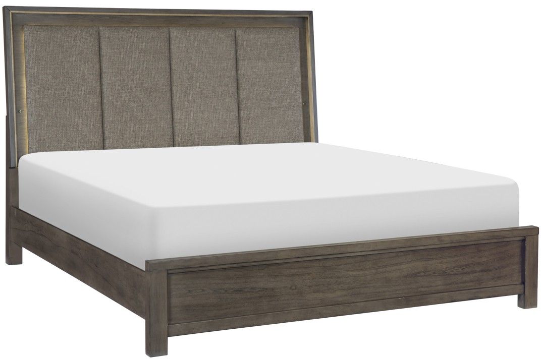 The headboard features LED backlighting, enhancing the gray fabric headboard insert while the mounted USB port provides convenient function.