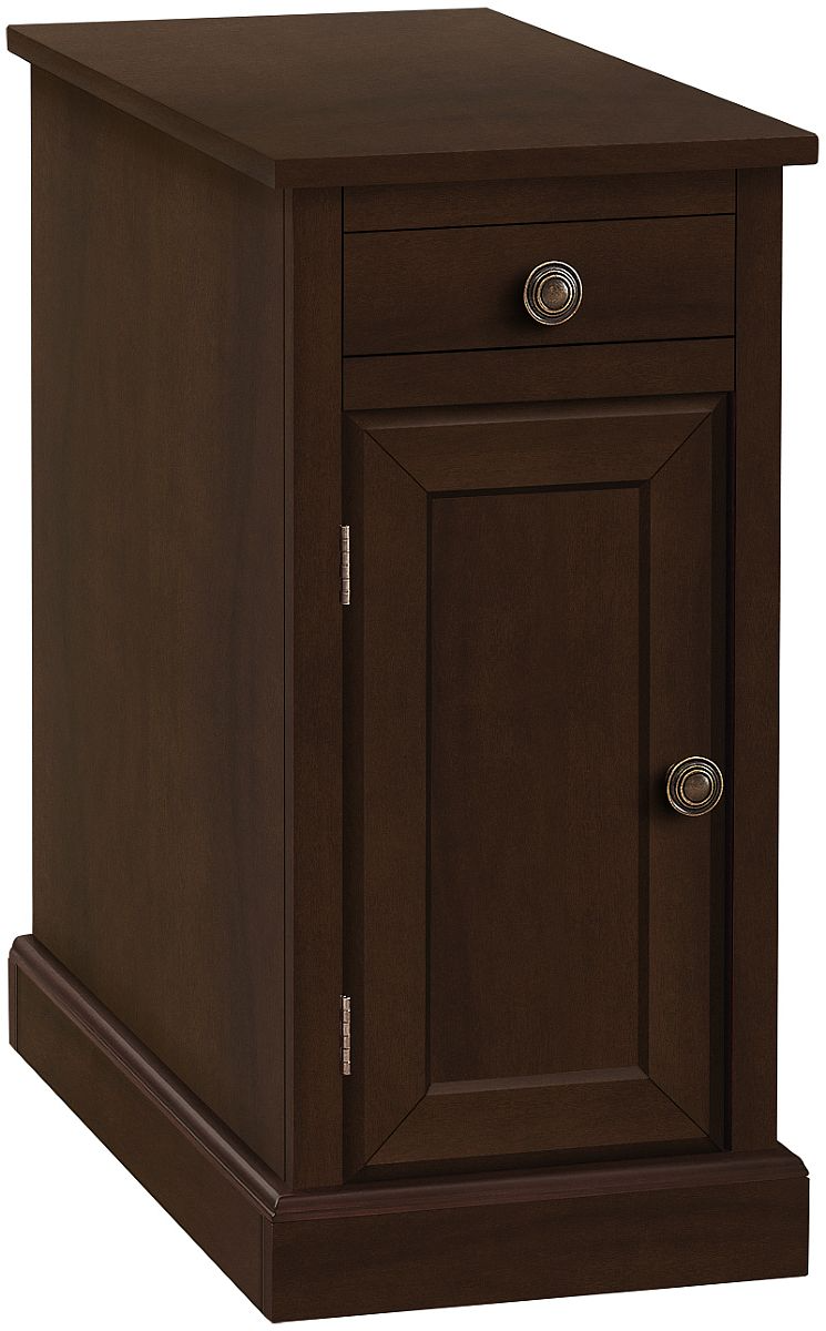 This fashionable side accent table with an easy to clean top is perfect to set next to a sofa or chair in your living room or setup a reading lamp on top and place in your bedroom as a charming nightstand. This traditional accent table with a space saving design has plenty of storage options that include a drawer and cabinet both accented with elegant metal knobs in a bronze finish, great to tuck away books, magazines, glasses or remotes. Durably designed and easy to assemble with full illustrated instructions and hardware, you will enjoy this fashionable style side table in your home for years to come. a 5-year limited warranty against manufacturer's defect is included to assure you are purchasing a quality piece of furniture.