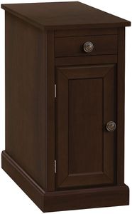 Versatile with fashionable style, narrow side accent table in a rich dark brown veneer finish with a storage drawer to use in a living room as an end table or in the bedroom as a convenient nightstand