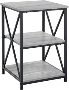This simple, contemporary style end table with an industrial look is a multi-functional accent piece suitable for any room. The stylish black metal legs with an “X” design on the two sides, contrasts with the warmth of the grey wood look laminate square tops. The two open bottom shelves offer a convenient storage space for books, magazines, or decorative objects with room on top for a small lamp or a place to set down your drink. Bring it into the bedroom as a sleek and compact nightstand for a clean modern touch. Assembly is required.