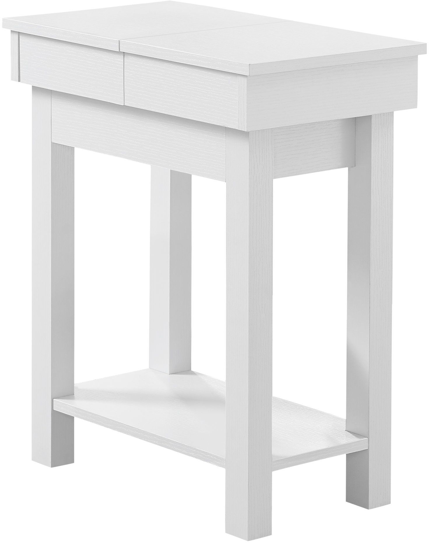 Add that extra touch to a room with this versatile side accent table in a smooth laminated white finish. This end table with a simple contemporary/transitional design in compact form provides ample storage space. Place a plant, a decorative object, or books on the spacious tabletop which slides open to reveal a hidden storage drawer to keep tv remotes, a tablet, or extra paper and pens within easy reach. The handy bottom shelf is perfect to store additional items. You will find so much use out of this accent table that you will want to add one to every room! Assembly is required.