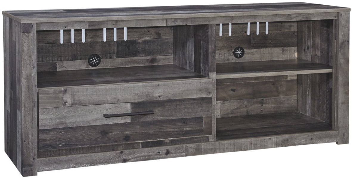 Make the Derekson 59-inch TV stand the center of attention with its popular urban eclectic style and functionality. Its rustic finish over a replicated pine grain creates an authentic natural look for your home entertainment area. You'll love its functionality. A spacious drawer, open cubby and adjustable shelf easily accommodate media needs. Cutouts keep wires out of sight and provide ventilation. Sold separately, an electric fireplace or integrated audio unit can easily be installed on the right-facing side. Assembly required for this product.Read More